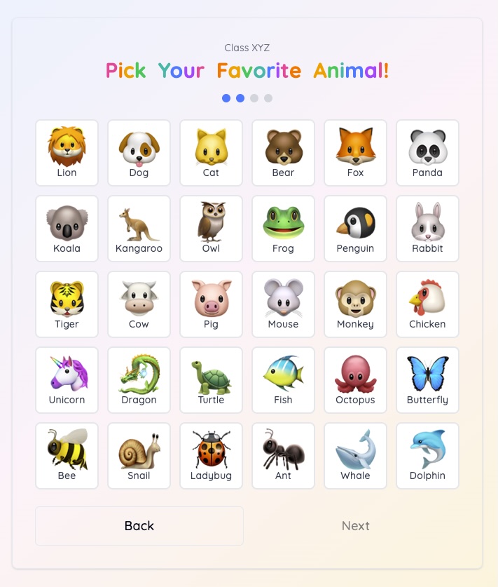 | Avatar | The animal emoji picture a student chooses to represent themselves. Students sign in by clicking their avatar. |
