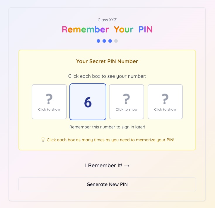 | PIN | A secret 4-digit number (like 7293) that only the student knows. This keeps their work private. |